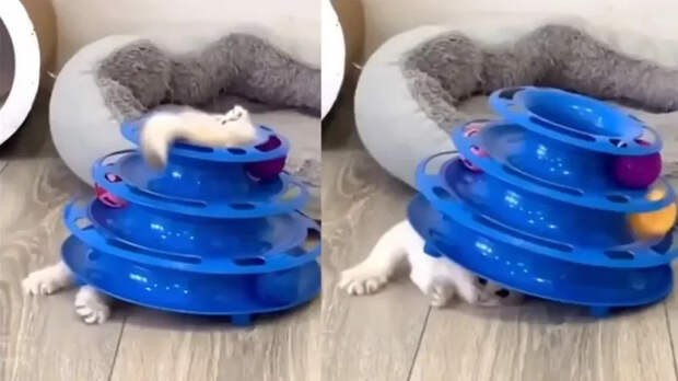 Котёнку подарили игровую пирамидку. Однако питомец не понял, как с ней играть.
