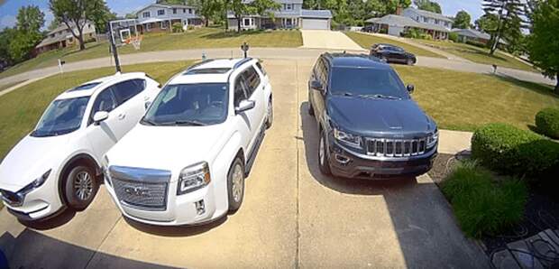 Камера наблюдения запечатлела необычный инцидент. Ветер поднял стоявший во дворе дома зонт и "воткнул" в лобовое стекло автомобиля.