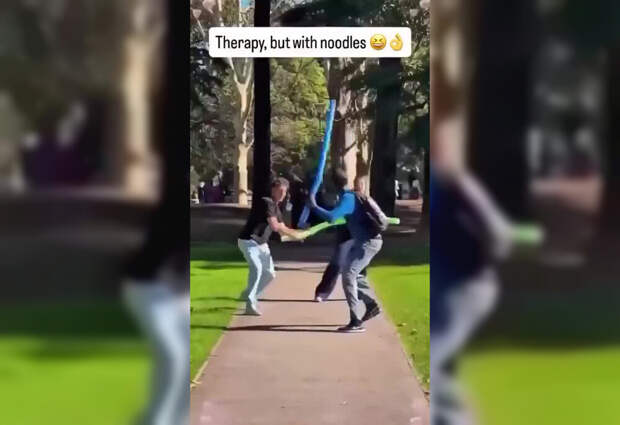 На улице парень устроил забавный перформанс: он подбрасывал прохожим воздушный шарик под ноги и предлагал «сразиться» на мечах.
