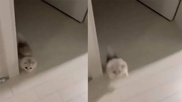 Маленький пушистый хищник, едва научившийся уверенно стоять на лапах, устроил засаду на хозяйку в прихожей.