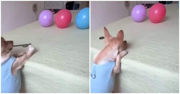 Пёс стреляет резинками для волос по воздушным шарам. Тот самый момент, когда не хочешь заводить пса сторожевой породы, но охранять дом кто-то должен.