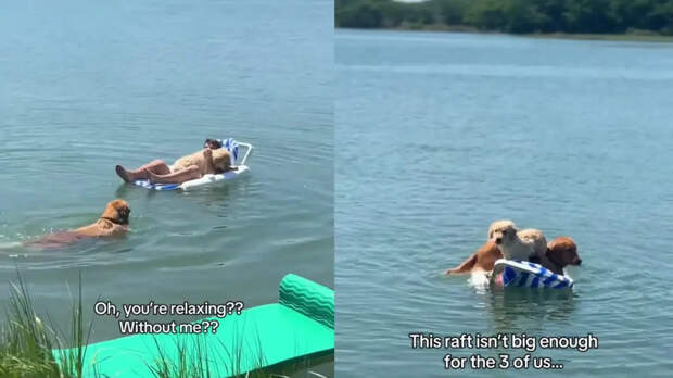 Сюжет этого ролика забавен до невозможности. Парень наслаждается безмятежным отдыхом в шезлонге на мелководье, но его покой нарушают два золотистых ретривера.