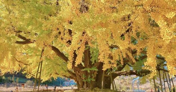 Каждый год поздней осенью тысячи людей съезжаются в деревню Бангё-ри, расположенную в южнокорейской провинции Кёнсан, чтобы увидеть красоту 860-летнего дерева гинкго билоба. При высоте около 32 м это даже не самое высокое гинкго в азиатской стране, но то, как раскинулись его ветви, делает дерево одним из самых впечатляющих на Земле.
