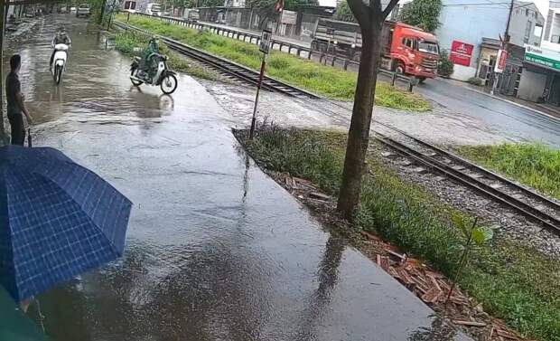 Женщина на скутере остановилась слишком близко к поезду. Вьетнам.