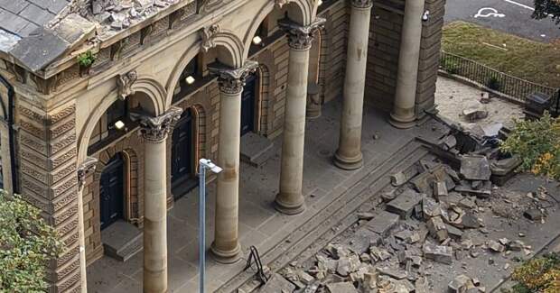 В Клекхитоне, Западный Йорк, Великобритания, фасад здания обрушился на тротуар. На место происшествия оперативно прибыли полиция и пожарные. На кадрах запечатлён момент, как прохожие в самый последний момент замечают неладное.