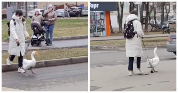 Хозяйку с необычным питомцем заметили в Подмосковье. Женщина с гусем на поводке переходила проезжую часть в Люберцах.