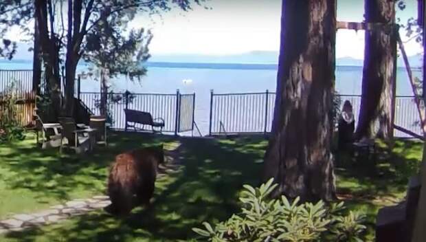Любопытный медведь пробрался на частную территорию и заметил дочь владельцев дома. Хищник с интересом наблюдал, как девочка качается на качелях.