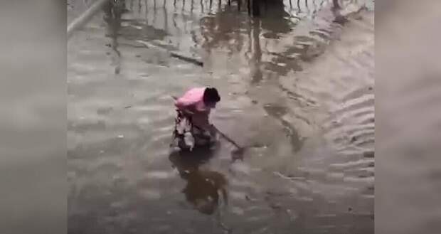 Женщина со шваброй буквально вручную нащупала ливневку и при помощи швабры загоняет непокорную стихию в канализацию, где ей и место.