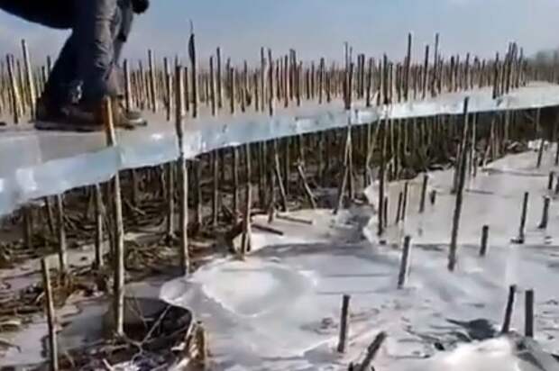 Где-то в Азии мужчина снял весьма необычное видео. С затопленного и замерзшего кукурузного поля ушла вода и оставшийся лёд повис на обрубках стеблей кукурузы.