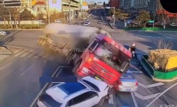 Видео от 5 февраля прошлого года. Мне оно раньше не попадалось, извиняйте если набаяню. В китайском городе Вэйхае, провинции Шаньдун, легковой автомобиль при повороте направо не из своей полосы подрезал грузовик. Автоцистерна не смогла избежать столкновения и опрокинулась, превратив легковой автомобиль нарушителя буквально в блин.