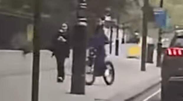 В Лондоне мужчина средь бела дня отобрал телефон у женщины, идущей по своим делам. Участник дорожного движения запечатлел момент налёта.