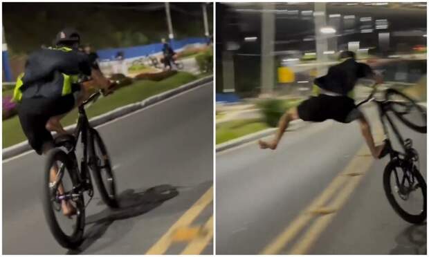 Интересное выступление велосипедиста. Ещё бы пару сантиметров и всадник остался бы без головы.