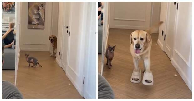Хозяин попросил собаку Дени принести тапки, и пес воспринял просьбу слишком буквально — надел их на передние лапы и гордо принес хозяину в гостиную.
