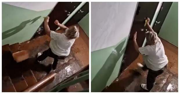 Эта женщина терроризирует всех соседей по адресу, Энтузиастов, 61б. Сегодня не могли выйти из квартиры, соседка таким образом решила её помыть!