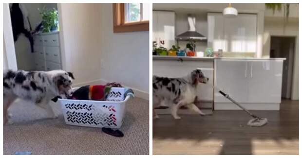 Эта собака всегда готова прийти на помощь своей хозяйке в домашних делах. С таким питомцем не пропадёшь!