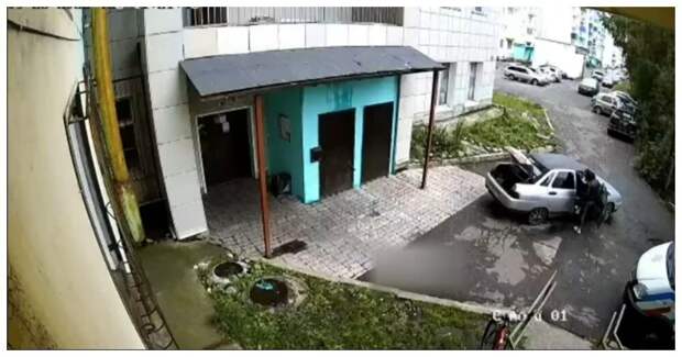 На камеру наблюдения попал момент побега нескольких молодых людей. Неизвестные с верхней одеждой в руках спрыгнули со второго этажа здания и спешно ретировались.