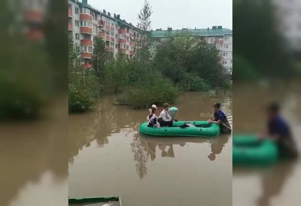 Кадры запечатлели в Уссурийске на Новоникольском проезде. На видео видно, что вся окрестность затоплена, а дети в праздничной форме и с цветами в руках плывут в школу на День знаний.