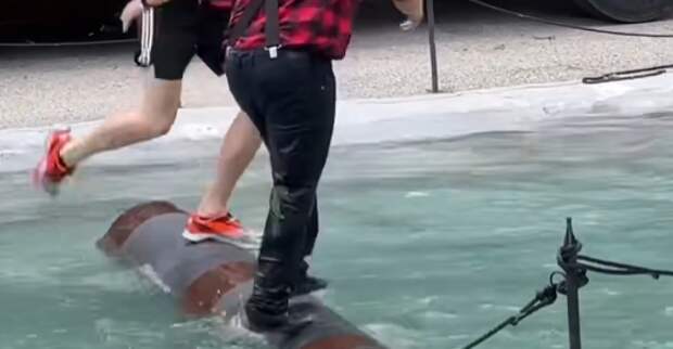 На ежегодной ярмарке в Помоне, США, двое мужчин решили поучаствовать в состязании Logrolling, в котором нужно балансировать на погруженном в воду бревне. Главная цель забавы - заставить противника упасть в воду.