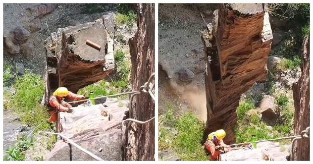 Рабочие спускаются по отвесным скалам, чтобы вручную сбивать опасные глыбы и предотвращать оползни. Такой способ считается самым надёжным, хоть и требует железных нервов.