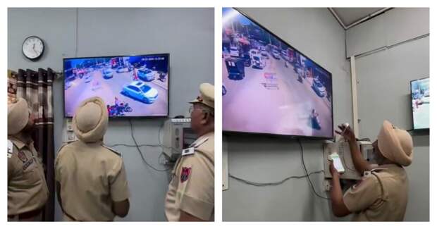 Сотрудники полиции в Индии стоят у телевизора и смотрят видеопоток с улиц, а затем вручную выписывают штрафы через терминал.