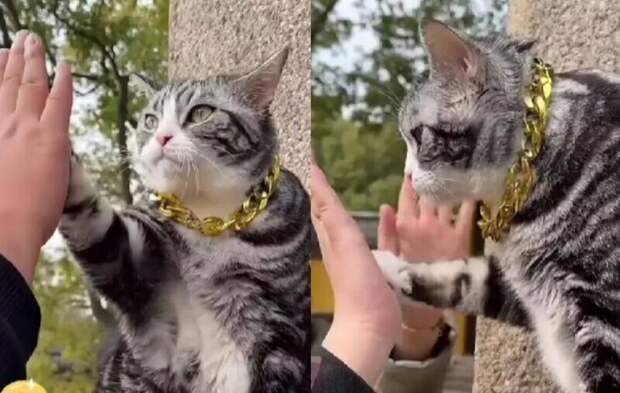 Кошка, живущая в храме в городе Сучжоу, стал звездой сети благодаря своему умению «давать пять» посетителям.