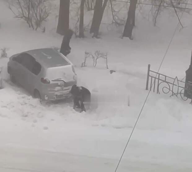 Видео из Хабаровска. У мужчины, видимо, не оказалось дома лопаты, поэтому он решил откапывать машину сковородкой.