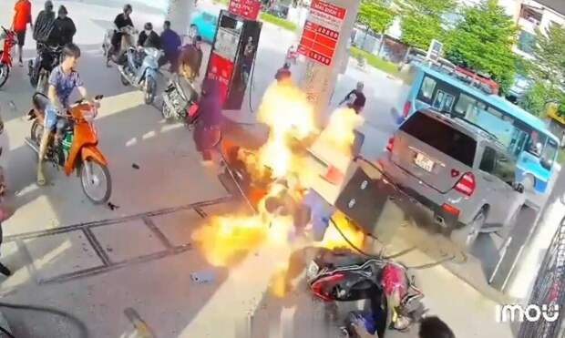 На АЗС в Хошимине (Вьетнам) водитель "Мерседеса" сдавая задним ходом сбил топливораздаточную колонку, придавив сотрудника станции, после чего начался пожар. Сгорело два мотоцикла.