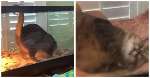 Кот залез террариум и использовал его в качестве лотка. Хозяйка запечатлела, как наглый питомец делает свое тёмное дело на глазах ящерицы.