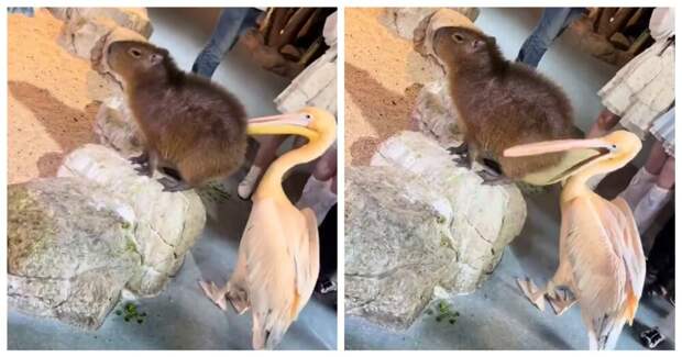 Пеликан решил попытать счастье в охоте на капибару. Пернатый попытался захватить в свой клюв любимца интернета.
