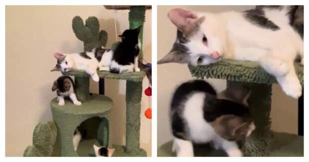 На видео запечатлели кошку, отдыхающую рядом со своими непоседливыми котятами. Сразу видно, мама счастлива.