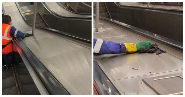 На видео видно, как работник метро чистит эскалатор тряпкой, которая выглядит сильно изношенной. Из-за её состояния создаётся впечатление, что поверхность скорее пачкается, чем моется.