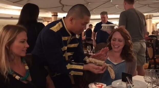 Парень в форме официанта подшутил над представительницами прекрасного пола в ресторане. Он показал девушкам фокус с салфеткой.
