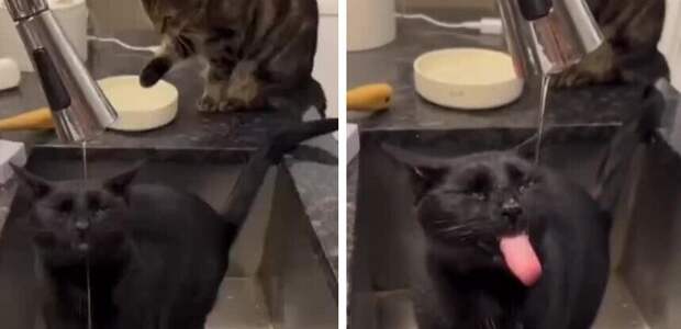 Два совершенно разных по характеру и привычкам кота, живущие под одной крышей, пьют воду. У каждого из питомцев свой подход к утолению жажды.