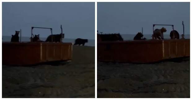 Мужчина ехал на автомобиле по песчаному берегу и сначала заметил двух медведей, затем он увидел еще около 10 медведей и начал кричать, и животные начали убегать.