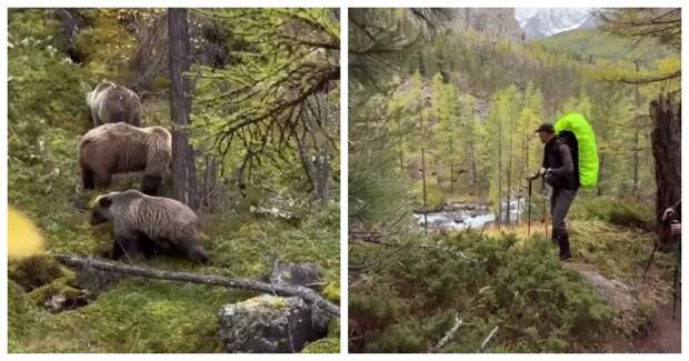 Компания туристов заметила семейство медведей в окрестностях реки Шавла на Алтае. Девушка запечатлела косолапых, занятых своими делами.
