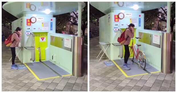 Эта подземная велопарковка находится возле станции Микавасима и вмещает 400 велосипедов. Клиент оставляет своё транспортное средство и получает талончик, а когда надо ехать — забирает велосипед примерно за 20 секунд.