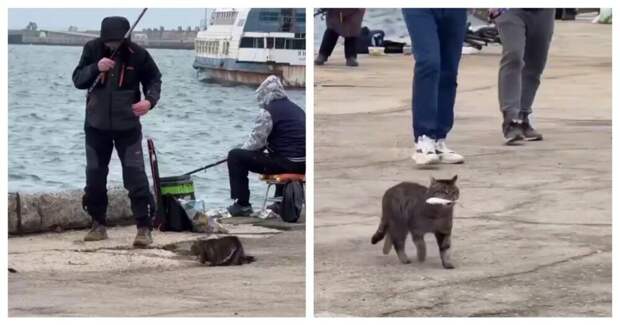 В Евпатории очевидцу удалось заснять преступление. Кот выждал момент и похитил часть улова рыбака.