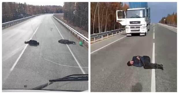 Водитель грузового автомобиля заметил двух мужчин, лежащий на трассе и решил выяснить, что с ними произошло.