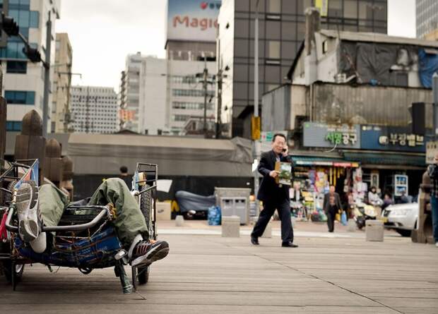 В Южной Корее бомжей не так много, но всё же они есть. Местные бродяги знают, где можно поспать и куда прийти за бесплатной едой и чувствуют себя практически всегда комфортно.