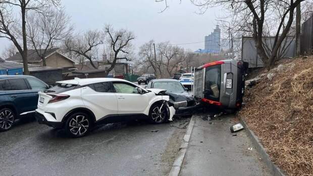 Во Владивостоке на улице Всеволода Сибирцева столкнулись "Тойота Краун Маджеста" и "Тойота С-ХР". Пассажира последней увезли в больницу. Водитель автомобиля "Ниссан Х-Трейл" пытался увернуться от столкновения, но в итоге завалился на бок.