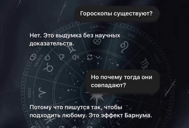 ИИ ответил, что это всего лишь выдумка, не подтверждённая научными доказательствами. Гороскопы составлены так, чтобы казаться подходящими каждому — это проявление эффекта Барнума, когда люди воспринимают обобщённые и расплывчатые утверждения как точное описание своей личности. Гороскопы не работают, это просто псевдонаука.