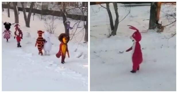 Аниматоры, одетые в костюмы героев мультфильмов, возвращались после проведения праздника.