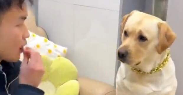 Хозяин перехитрил своего пса, который не хотел пить лекарства. Парень сделал вид, что съел таблетку, а затем скормил ещё одну питомцу.