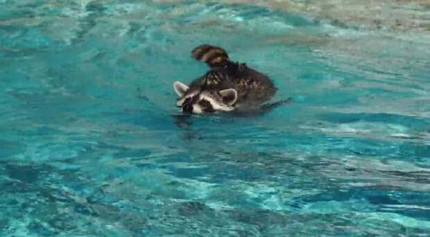 Крошка енот решил отдохнуть на территории отеля в Сочи. Зверька особенно заинтересовал бассейн.