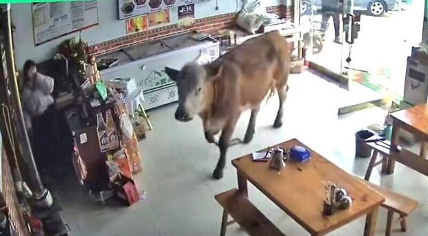 Камеры наблюдения, установленных на территории кафе на юге Китая, запечатлели корову. Животное сбежало от фермера и заглянуло в заведение.