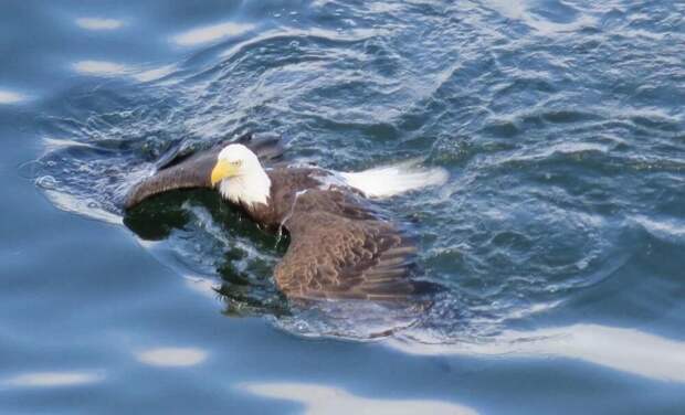 Белоголовый орлан ловит крупную рыбу или водоплавающих птиц в водоеме и плывет вместе с добычей до берега.