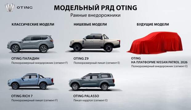 Концерн Sinomach Auto, представляющий в России марку Oting, объявил о грядущем расширении модельного ряда. К продающимся сейчас «Паладину» и Palasso прибавятся два новых пикапа с названиями Z9 и Rich 7, а также некий внедорожник, который, как утверждается, базируется на платформе Nissan Patrol нового поколения.