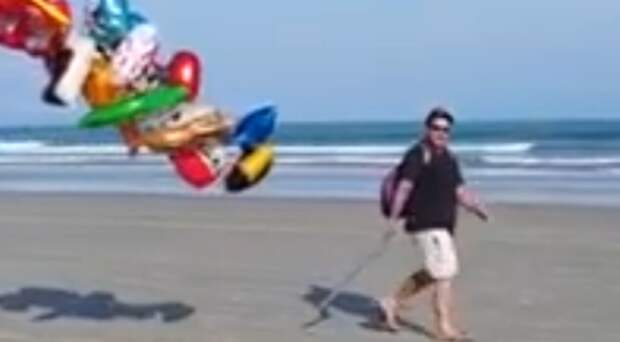 Очевидец запечатлел внушительный запас воздушных шаров у мужчины. Незнакомец ходил по пляжу и продавал их всем желающим.
