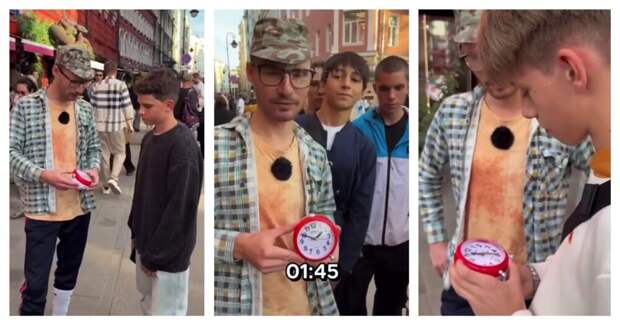 Парень вышел на улицы Москвы с обычными стрелочными часами и попросил незнакомцев выставить на них время.